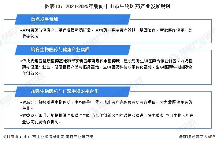 2021-2025年,中山市发展生物医药产业,主要规划涉及明确重点发展领域、培育生物医药产业集群、加强与广深港澳对接合作。中山市将重点发展新药研发、生物药、高端医疗器械、基因治疗、智能医疗健康、美妆等领域,依托火炬区健康医药基地和翠亨新区华南现代中医药城,建设相关生物医药产业集群。此外,在对外合作方面,主要是引进深圳高端生物医药产业、与香港共建生物医药合作创新区。