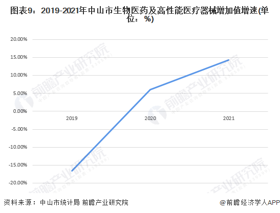 根据中山市统计局公报数据,2019-2021年,中山市生物医药及高性能医疗器械增加值增速实现由同比下降至同比增长的反弹态势。2021年,中山市生物医药及高性能医疗器械业增加值同比增长14.3%,高于中山市全部工业增加值10.7%的增速,生物医药产业发展势头良好。