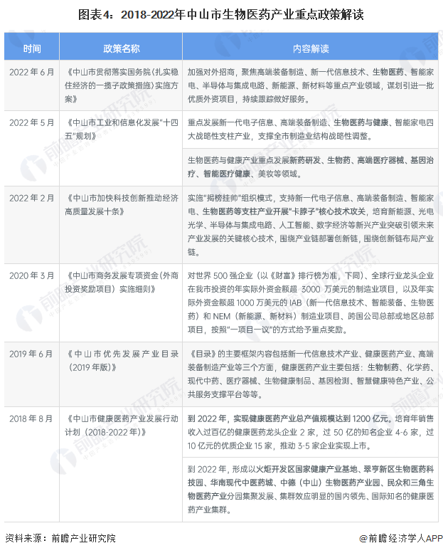 根据2022年5月中山市工业和信息化局出台的《中山市工业和信息化发展“十四五”规划》,中山市将重点发展新一代电子信息、高端装备制造、生物医药与健康、智能家电四大战略性支柱产业,支撑全市制造业结构战略性调整。到2024年,培育形成1个产值1000亿元健康医药产业集群。到2025年,中山市生物医药等支柱产业集群营业收入年均增速不低于10%。