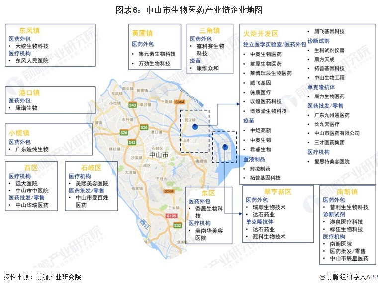 在政策指引和市场需求的驱动下,中山市生物医药产业链不断完善,其中,在上游独立医学实验室、医药外包;中游疫苗、血液制品、诊断试剂、单克隆抗体;下游销售渠道等环节均有企业布局: