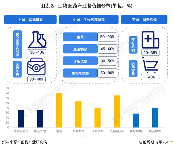 生物医药产业链上游为基础研究,包括独立医学研究室、医药外包等等;中游是生物医药制造,包括疫苗、血液制品、诊断试剂、单克隆抗体等细分产品;下游主要是医疗机构、医药零售渠道等。根据生物医药各产业链环节的毛利率状况可知,目前,生物医药中游的疫苗、血液制品、单克隆抗体等毛利率较高,其中疫苗的代表性上市公司毛利率高达50%-90%、血液制品代表性上市公司毛利率高达45%-60%,这体现了医药行业特性是高投入、高利润回报。