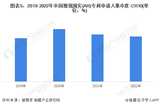 2019-2022年,中国增强现实(AR)专利申请人CR10呈现波动态势,由2019年的13.32%升至2020年的16.16%,随后两年下降,2022年为13.87%。整体来看,中国增强现实(AR)专利申请人集中度中等,但集中度在近两年呈现下降趋势。