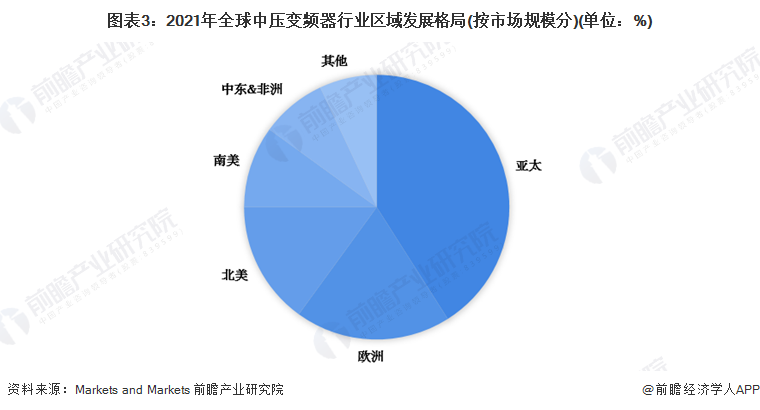 根据Markets and Markets的数据显示,全球变频器市场中,占比最大的是亚太地区,约为41%;其次为欧洲和北美地区,占比分别为19%和15%。从中国中压变频器市场规模在变频器市场整体占比来看,中压变频器作为变频器的细分产品之一,其市场规模稳定为变频器市场的三成左右,因此可以推测出Markets and Markets统计的全球变频器市场占比,基本可以代表全球中压变频器区域分布情况。