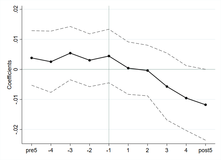 平行趋势检验图要求政策实施前的系数都不显著,对政策实施后的系数显著性不做特别要求,但是最好政策实施后不能都不显著,你在调整下,你政策实施前是满足的,实施后看起来全是不显著的。