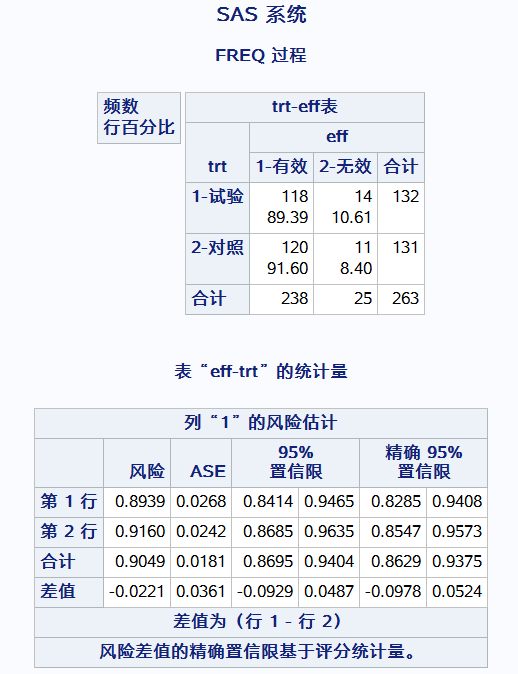 whymath 发表于 2023-3-2 20:20 使用 proc freq 可以计算样本率差的点估计及其置信区间。 结果为: