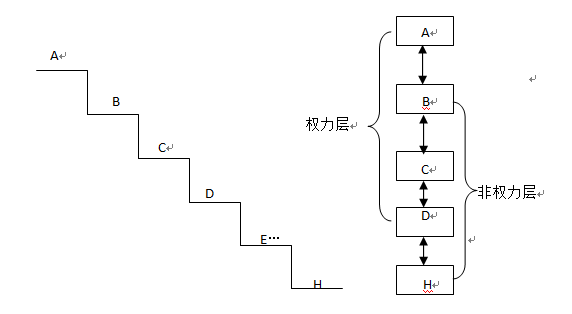 图中,A、B、C、D、E……H,依次表示为:中央级、省级、市级、县级、镇级……和人民,这便是有史料记载以来人类管理体制的结构。其管理流程:管理从中央级开始逐级的管理而下,意见的反馈又逐级而上。我便把这个管理流程称为“来复式”管理流程。“来复式”管理流程也就构成为阶梯式的管理原理。