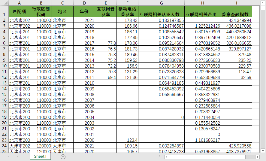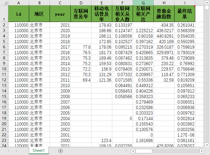 初始计算结果:会计年度、省代码、省、互联网普及率、互联网相关从业人员数、互联网相关产出、移动互联网用户数、数字金融普惠发展