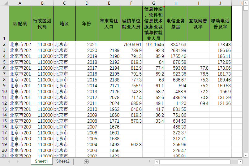 会计年度、省代码、省、年末常驻人口、电信业务收入市、移动电话年末用户数、互联网宽带接入用户数、城镇单位从业人员期末人数、第三产业_信息传输计算机服务和软件业
