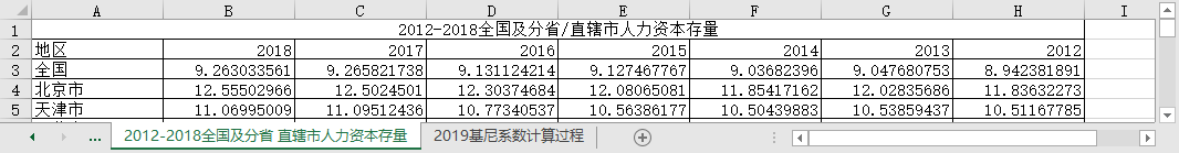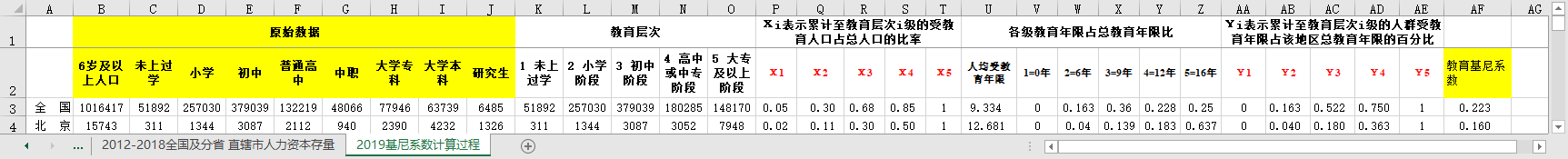 包括全国及分省/直辖市教育基尼系数2012-2019、2019基尼系数计算过程、全国及分省/直辖市人力资本存量2012-2018。