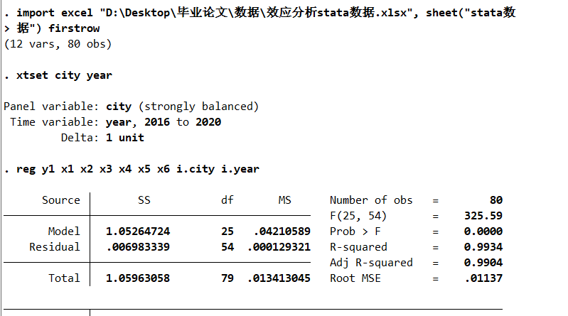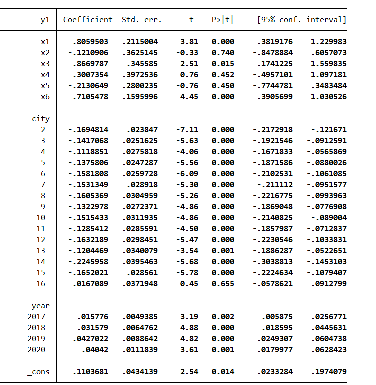 WZM- 发表于 2023-3-4 21:12 代码是xtset city yearreg y x1 x2 x3 x4 x5 x6 i.city i.year 一个16个城市,2016到2020年,出来的结果只 ...