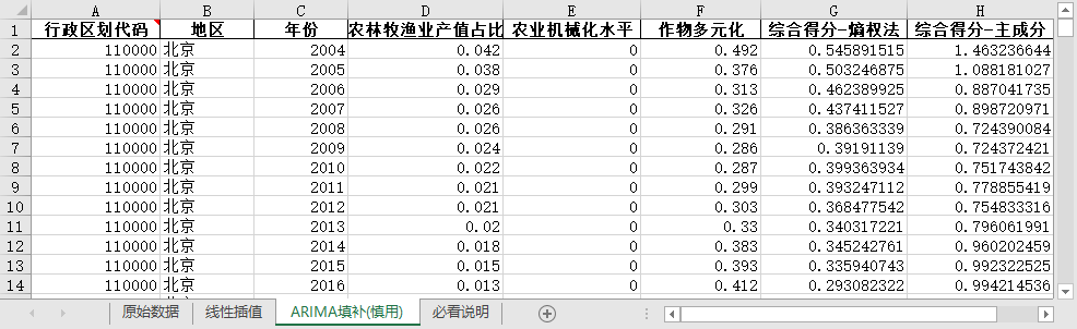 行政区划代码 地区 年份 农林牧渔业产值占比 农业机械化水平 作物多元化 综合得分-熵权法 综合得分-主成分