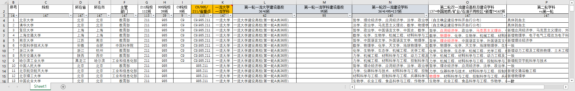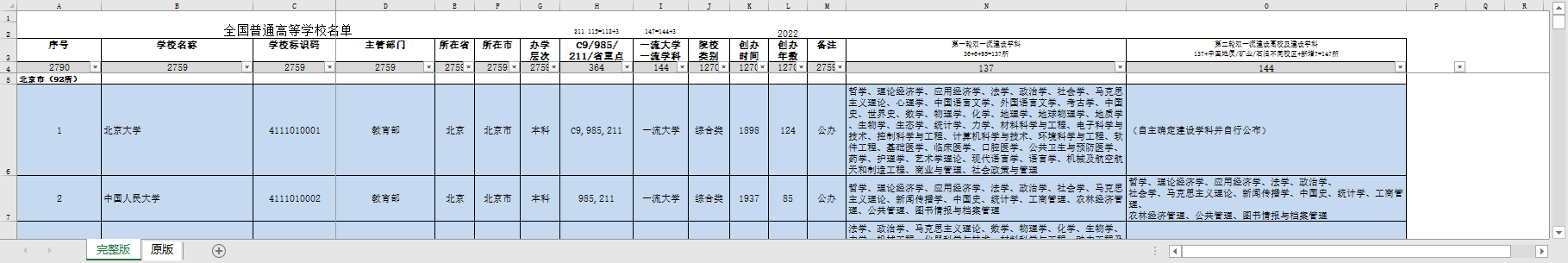 全国普通高等院校本科大专高校清单2023年版本Excel表格