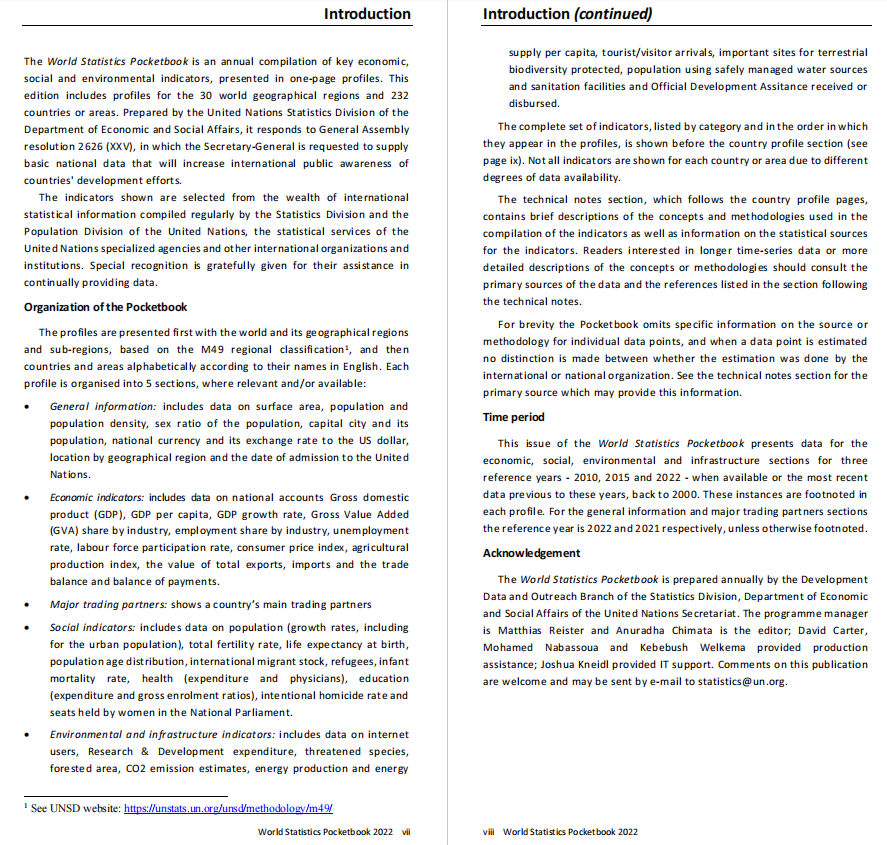 The World Statistics Pocketbook, 2022 edition is the forty-sixth in a series of annual compilations of key statistical indicators prepared by the United Nations Statistics Division of the Department of Economic and Social Affairs. Over 50 indicators have been collected from more than 20 international statistical sources and are presented in one-page profiles for 30 world geographical regions and 232 countries or areas. The Pocketbook is organized into 5 sections; general information, economic indicators, major trading partners, social indicators, and environmental and infrastructure indicators. This issue presents data for the economic, social, environmental and infrastructure sections for three reference years - 2010, 2015 and 2022 - when available or the most recent data previous to these years, back to 2005, when it is not. For the general information and major trading partners sections the reference year is 2022 and 2021 respectively, unless otherwise footnoted. The indicators in the profiles cover the following topics: communication, crime, development assistance, education, energy, environment, finance, gender, health, international tourism, international trade, labor market, national accounts, population and migration, price and production indices and science and technology.