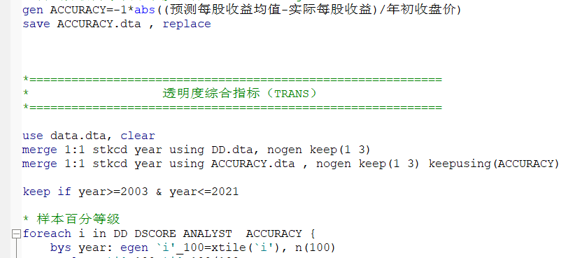 根据Bushman et al.(2004)的定义,透明度是指外部信息使用者能够有效获得一个公开交易上市公司特定信息(如年报、各种信息披露公告、分析师报告、企业自愿披露的信息)的程度。具体说来,参考之前的文献,我们从盈余质量、信息披露考评指数、分析师盈余预测和审计师角度计量公司的透明度。- 第一个透明度指标是根据调整的Dechow and Dichev(2002)模型计算的盈余质量指标(DD)。这一指标广泛应用于财务报告质量的研究文献之中。为计算该变量,我们首先分行业和年度估计如下模型: