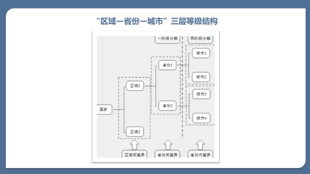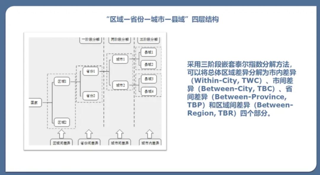 https://www.bilibili.com/read/cv17765786以此类推,当面对层级数更多的样本时,泰尔指数还可以继续分解。我们在此分享的就是在两阶段泰尔指数分解的基础上再分解一次的“三阶嵌套泰尔指数分解方法”,刘金东和靳连峰(2011)对三阶嵌套分解做了较早的尝试,对中国经济进行了包含地带、省、市、县的三阶嵌套分解,分解方法如下图所示: