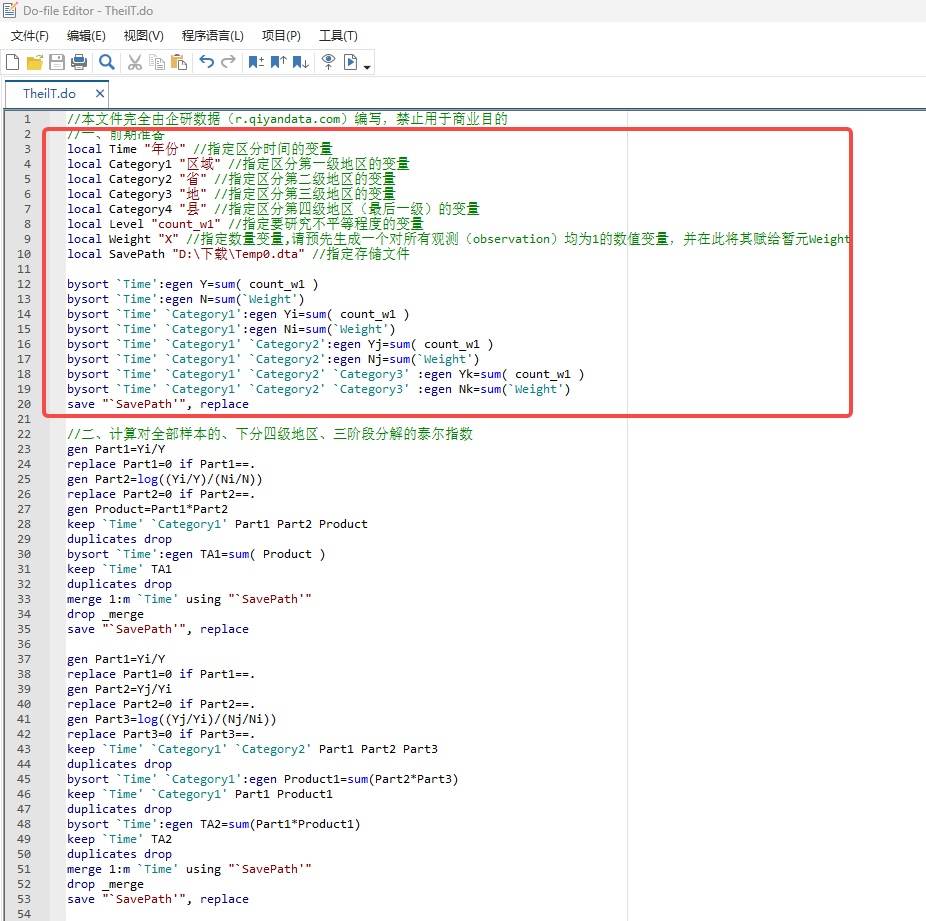 Part3 STATA代码介绍与使用说明1. 完整计算三阶嵌套泰尔T指数的情形我们的STATA的Do文件中的代码依次由五部分组成: