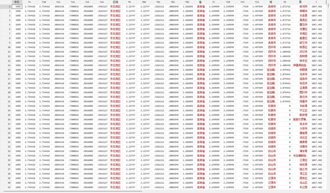 最终得到的数据如下图所示,为方便比较,我们将全部样本的泰尔指数字段排在年份后;各区域内样本的泰尔指数字段排在区域后;各省份内样本的泰尔指数的字段排在省份后;各地级行政区内部样本的泰尔指数的字段排在地级行政区后。