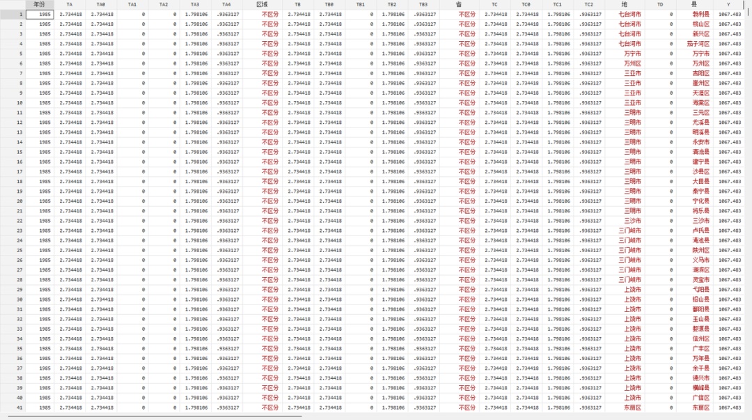 同样,如果只想研究地级和县级层面的,那么我们只需要将【区域】和【省】字段都设为“不区分”,那么就会直接从地级开始分解,TA1 TA2和TB1都会是0,如下图所示: