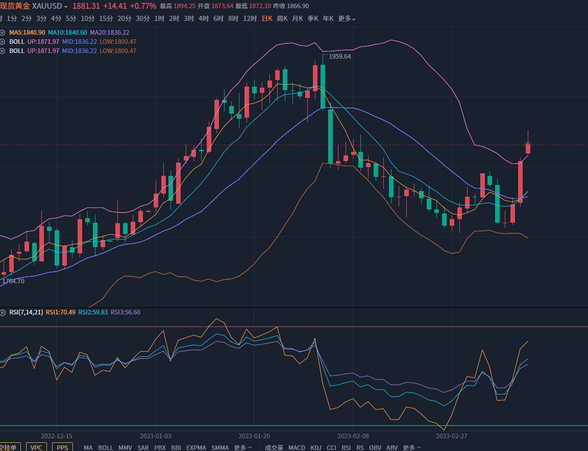 ①、黄金开盘后受避险情绪以及美银行债务危机的蔓延影响出现惯性上涨一度冲击日线强压1890一带,目前来说黄金风头短期多头强势,至于为何说短期是多头,主要是因为本周的CPI数据才是真正决定加息的关键因素,同时也是趋势的奠基石,所以周初的上涨暂时不用追,等待加息策略落地。个人见解:就美联储本次加息恐怕将搁浅了,一旦选择继续加息那么美银行倒闭的危机将接踵而来,大概率美会选择救市,所以加息的风头会减弱,黄金近期高位运行是常态,短线布局上因1890是强压线,周初将围绕此位进行震荡,那么个人建议大家可先选择高空来循环应对,点位上激进可现价1883直接空,稳健1887-1890开空,目标先看1856-1850一线,静待本周CPI数据迎趋势。因文章有滞后性,故以上解析供参考。