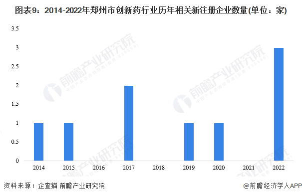 根据企查猫查询数据显示,近年来郑州市创新药注册企业数量波动增长。2022年新增注册企业3家,为历年来最多,均为研究类公司(研究中心),将为郑州市创新药研发增添新的活力。