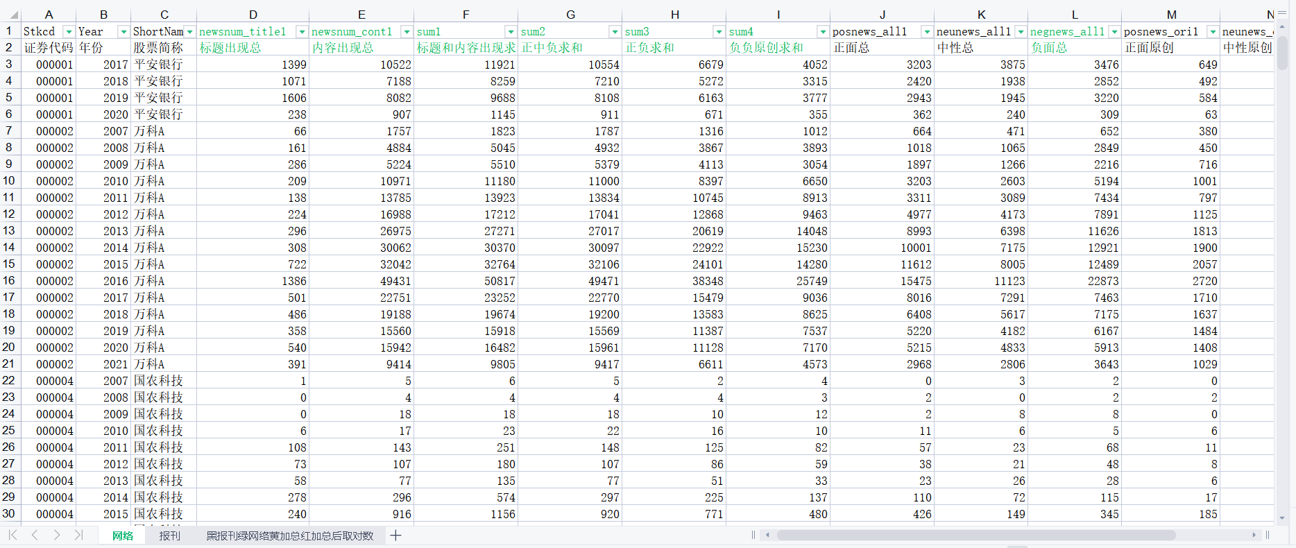 王忠鹏 发表于 2023-3-16 22:32 媒体关注媒体关注度媒体监督数据2007—2021年,已求和汇总可直接使用 1.报刊财经新闻量化统计 2.网络新闻 ...