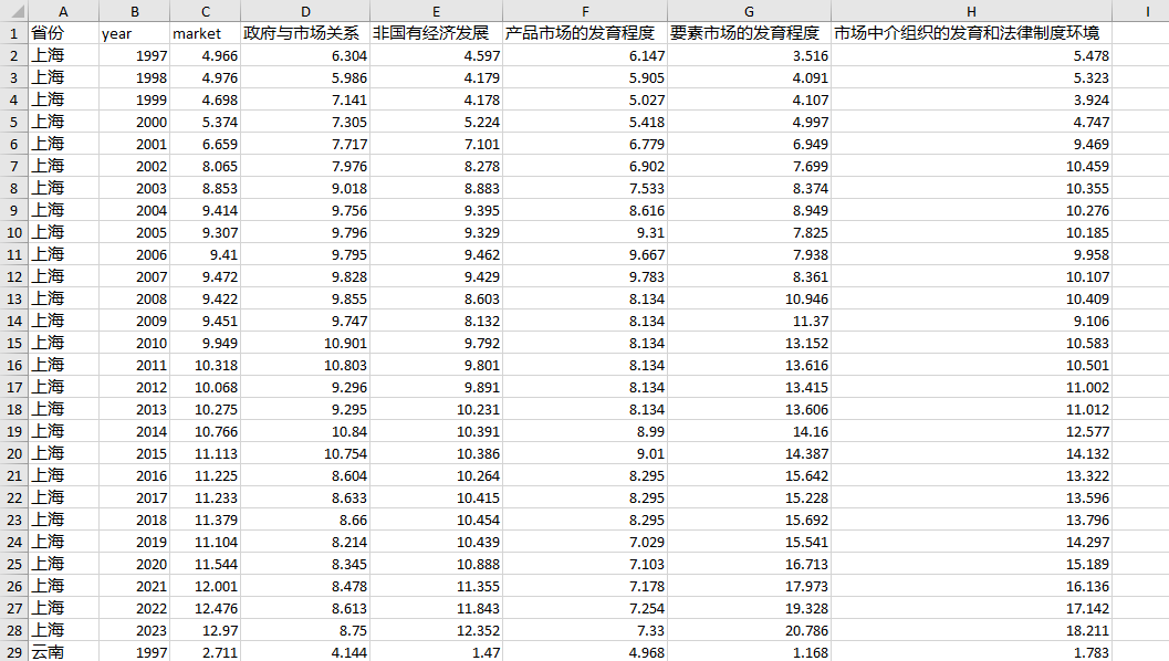 (2)计算结果(将 “1997-2023年市场化指数”和“公司资料”(上市公司注册地所在省份)进行匹配之后的数据)
