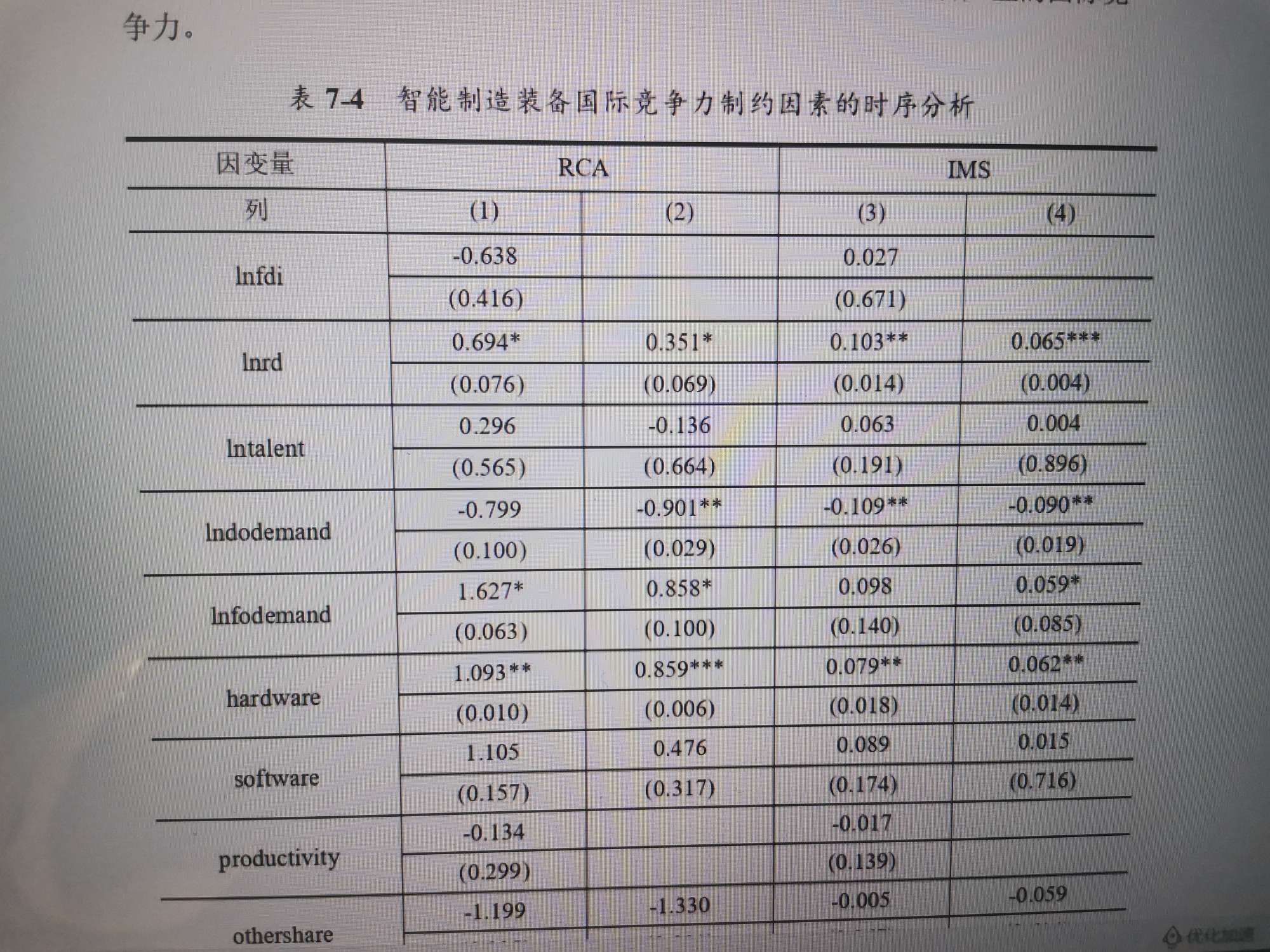 首先这张表里因变量是有两个,第一个是RCA,第二个是用来当做替代被解释变量的IMS;第一列是RCA对所有解释变量进行回归得到的结果,第二列是RCA对除了lnfdi和productivity两个解释变量的其他变量进行回归得到的结果,第三和第四列同理,只是把被解释变量换成了IMS重新进行一遍回归