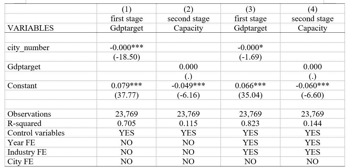 ivregress2 2sls Capacity Size Lev Staff SOE Age TFP Market ROA Tophold Top2_10 Gdp_last Gdp_p (Gdptarget=city_number)i.year i.industry, first