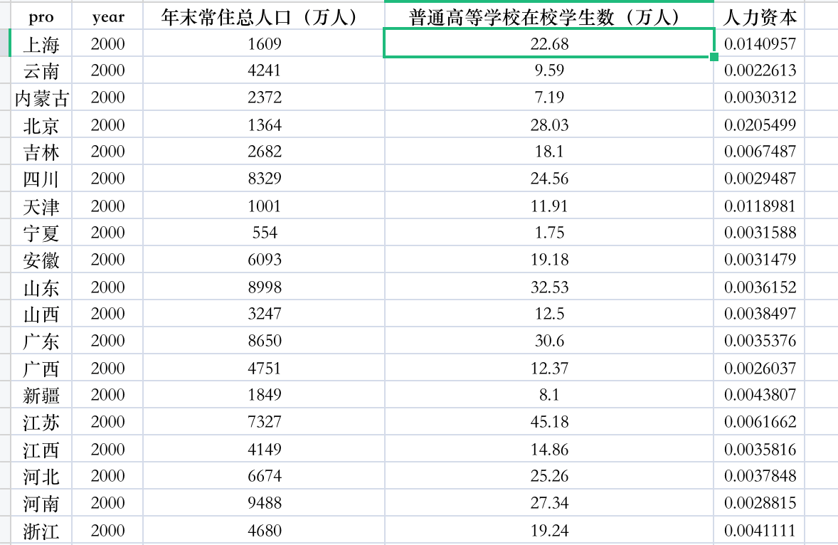 计算方法:人力资本=普通高等在校学生数/总人口