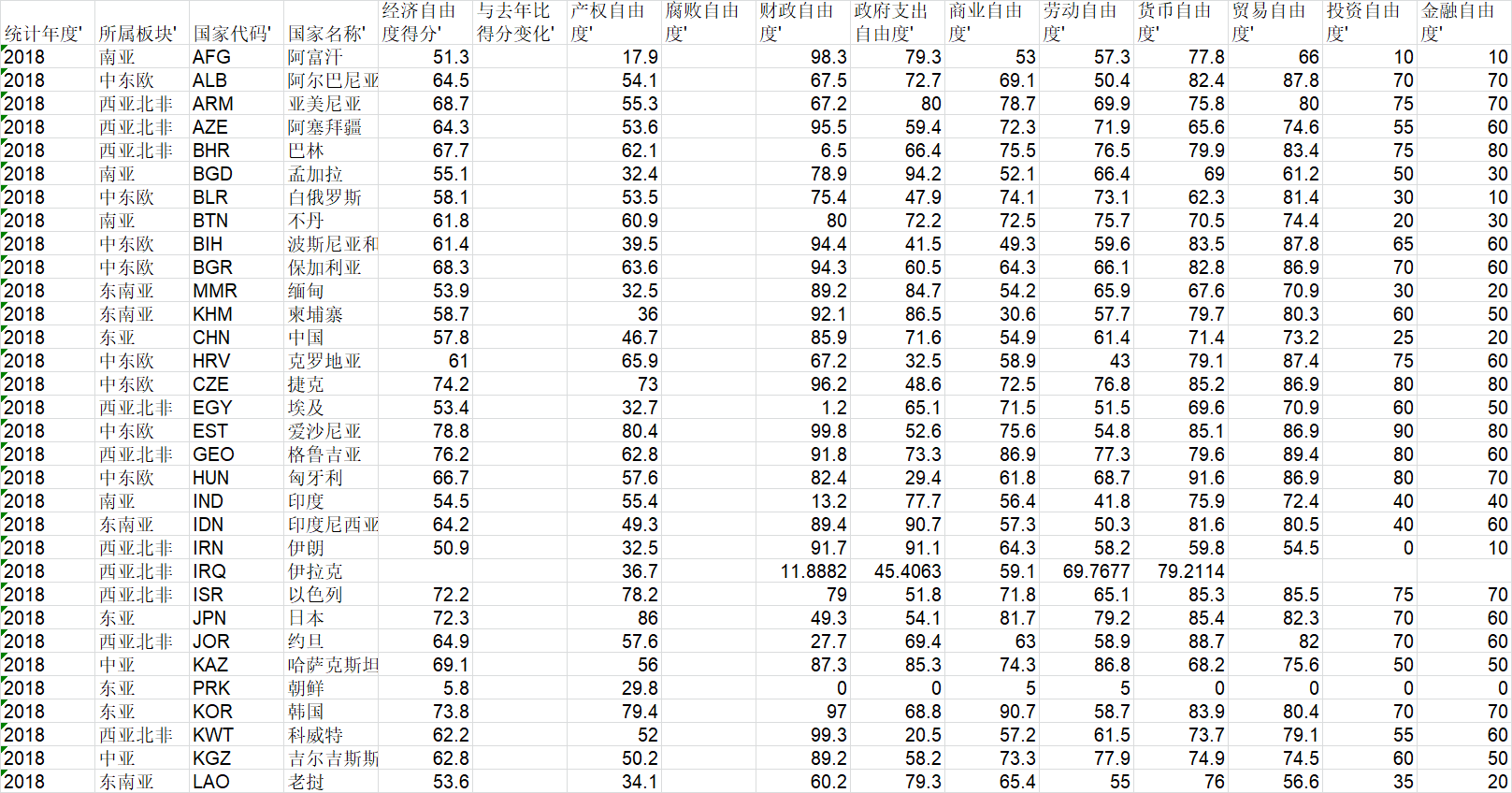 中国与一带一路国家建立的友好城市数量 | 1973-2018 | 497 | 一带一路国家经济自由度指数(产权、腐败、财政、商业、劳动、货币、贸易、投资、金融自由度等) | 2003-2018 | 9832 |