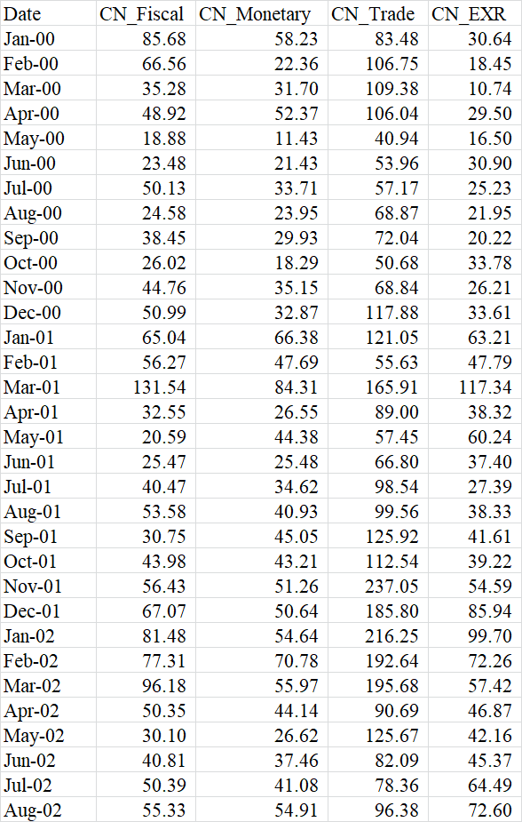 中国城镇及农村居民人均可支配收入和指数 | 1978-2021 | 156 | 南华早报版中国经济政策不确定性指数(月度) | 1949-2021 | 1458 |