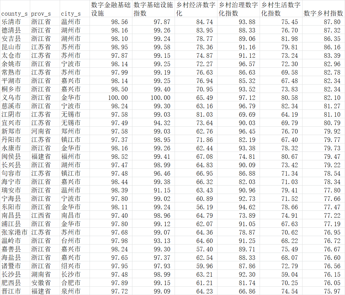 中国地级市数字经济指数(熵值法和主成分法)(互联网、电信、邮政、移动电话、数字普惠金融等维度) | 2011-2019 | 5196 | 县域数字乡村指数数据(数字金融、数字基础设施、乡村数字经济、乡村数字治理、乡村数字生活) | 2018 | 11286 |