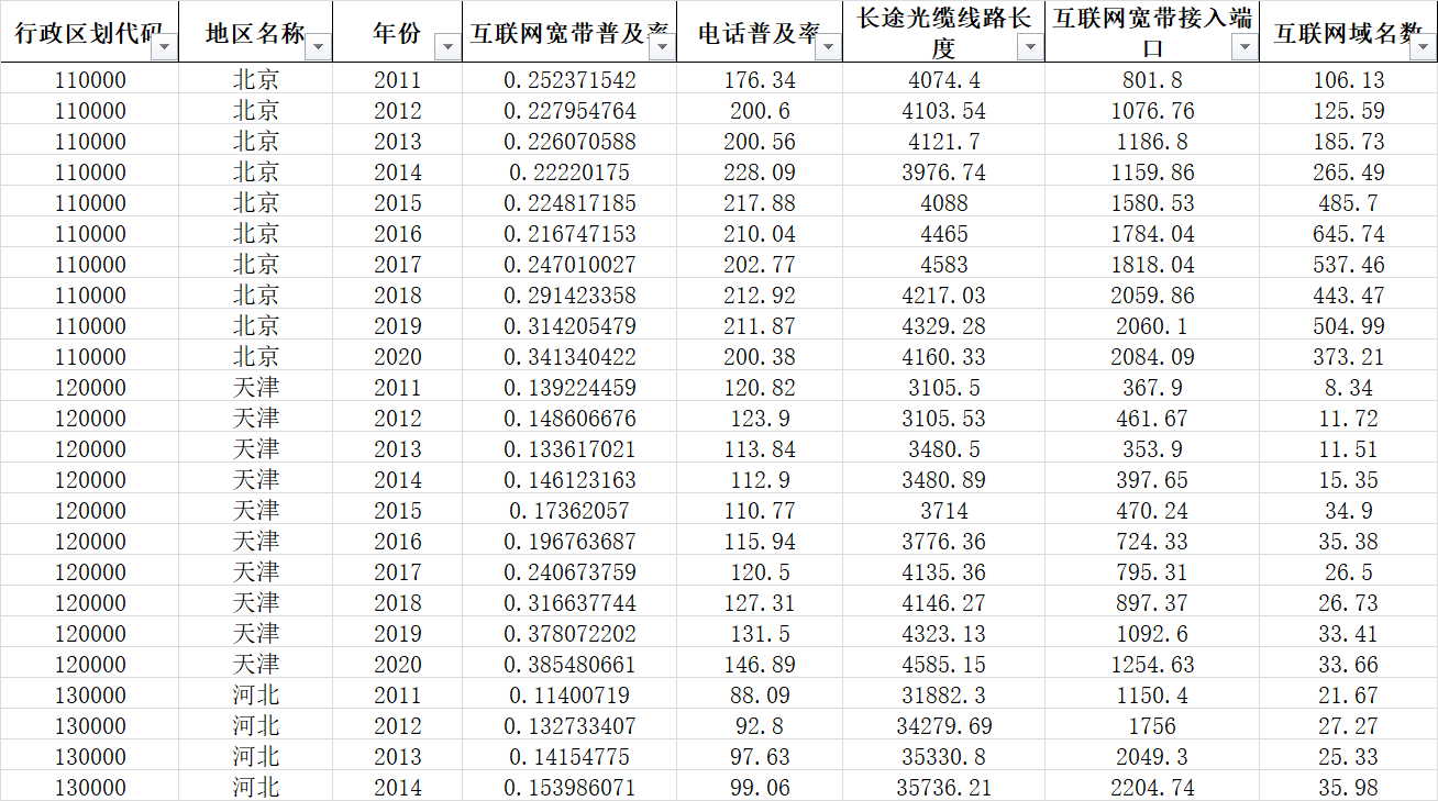 中国省级数字化经济指标(数字经济基础设施)(含原始数据) | 2011-2020 | 1555 | 中国地级市数字经济指数(中国数字经济白皮书)(数据及信息化基础设施、城市服务、城市治理和产业融合四个纬度20多个变量测算) | 2017-2021 | 716 |