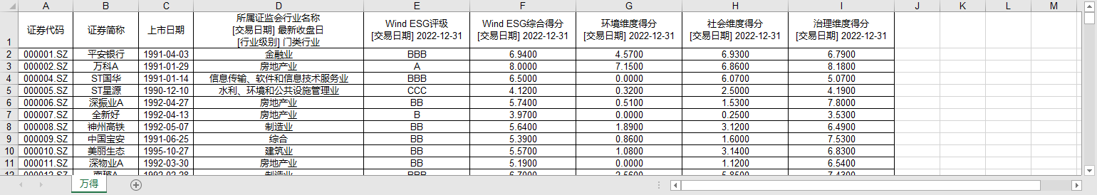 内容包括:Wind ESG评级、Wind ESG综合得分和各项得分