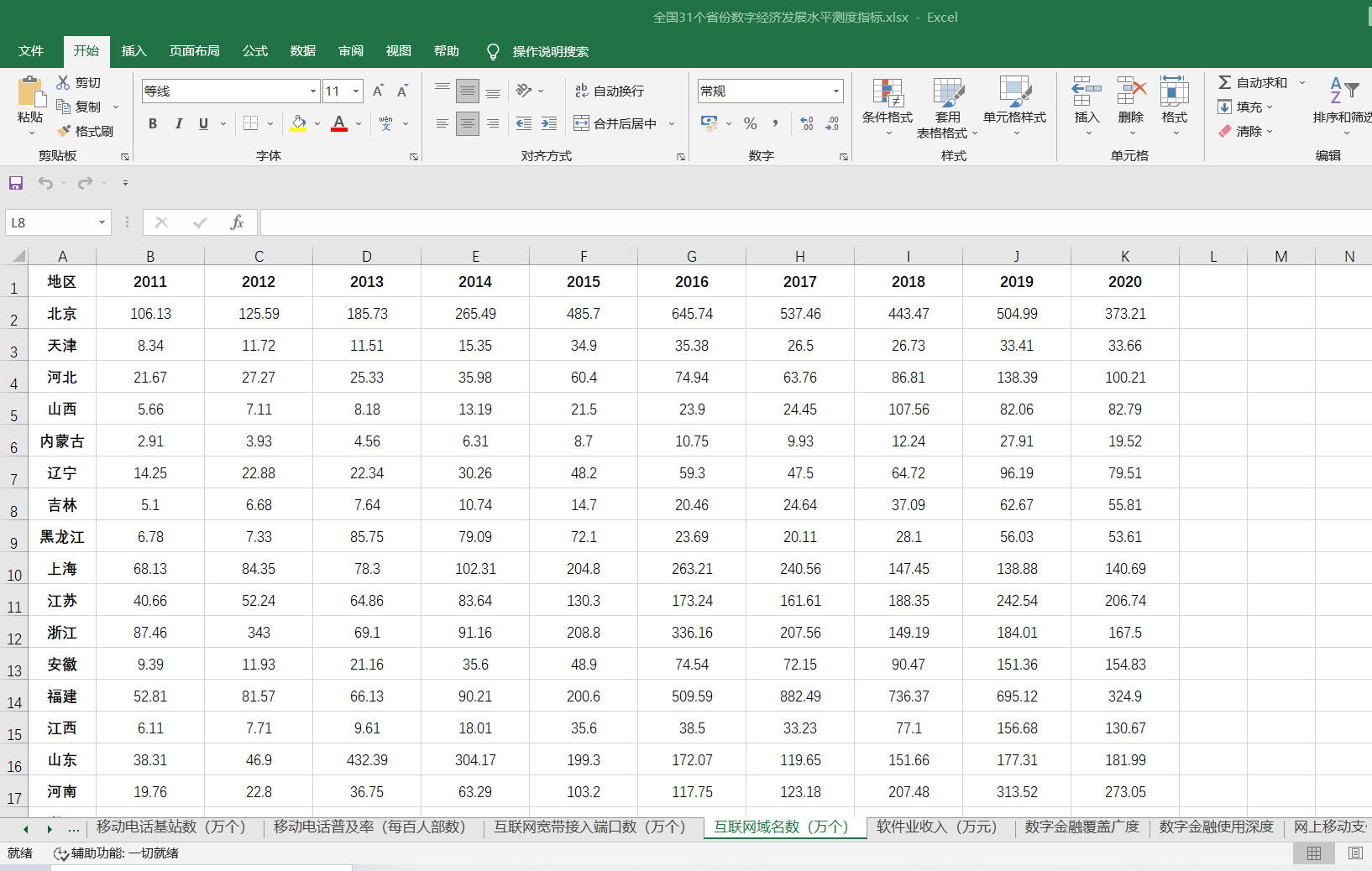 此为2011-2020年全国31个省份数字经济发展水平测度指标,分别为光缆长度(公里)、移动电话基站数(万个)、移动电话普及率(每百人部数)、互联网宽带接入端口数(万个)、互联网域名数(万个)、软件业收入(万元)、数字金融覆盖广度、数字金融使用深度、网上移动支付水平、规模以上工业企业R&D人员折合全时当量(人年)、规模以上工业企业R&D项目(课题)数(项)、技术合同成交总额(万元)、发明专利申请数(件)、专利申请授权数(件)、信息服务业从业人数(万人)、信息服务业产值(亿元)、电信业务量(亿元)等指标。