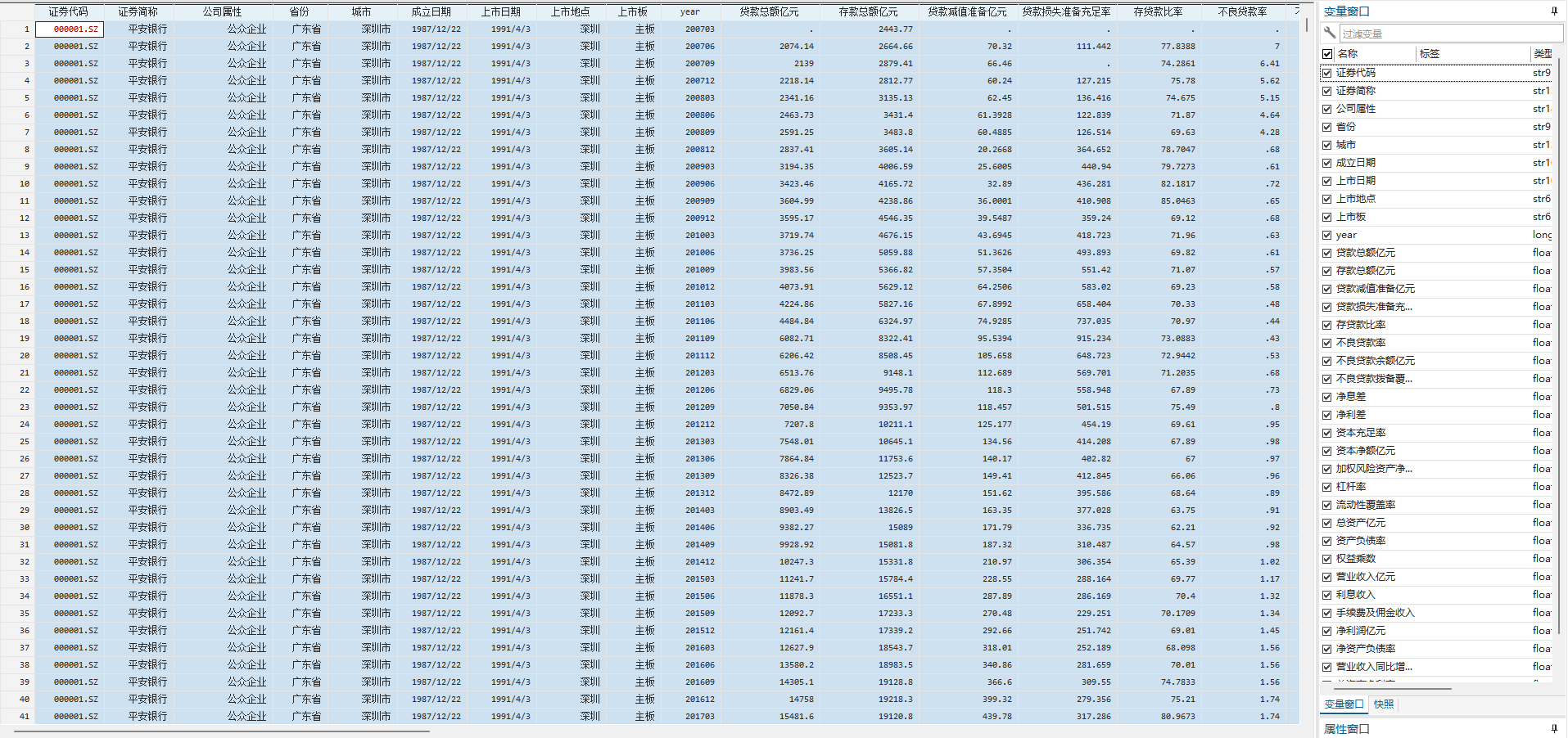 指标含代码 简称 公司属性 省份 城市 成立日期 上市日期 上市地点 上市板 贷款总额 存款总额 贷款减值准备 贷款损失准备充足率 存贷款比率 不良贷款率 不良贷款余额 不良贷款拨备覆盖率 净息差 净利差 资本充足率 资本净额 加权风险资产净额 杠杆率 流动性覆盖率 总资产 资产负债率 权益乘数 营业收入 利息收入 手续费及佣金收入 净利润 净资产负债率 营业收入同比增长率 总资产净利率 净资产收益率 银行业景气指数 省GDP增长率 全国GDP增长率
