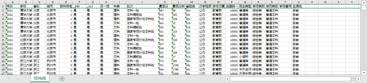 年份 学校 省份 城市 软科排名 _985 _211 双一流 科类 批次 zui低分 zui低分排名 省控线 办学性质 学校归属 全国统一招生代码 招生类型 学校类别 学历类别 学校曾用名 生源地