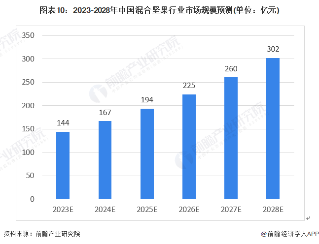 根据前瞻产业研究院的预测,每日坚果行业的市场空间良好,每日坚果产品营养搭配均衡且便于携带,疫情过后,伴随着消费升级,坚果的核心消费群体潜力将有效释放,2023年我国混合坚果行业有望快速反弹,2023-2028年我国混合坚果行业市场规模年均复合增速将达到16%,预计到2028年我国混合坚果行业市场规模将达到302亿元。