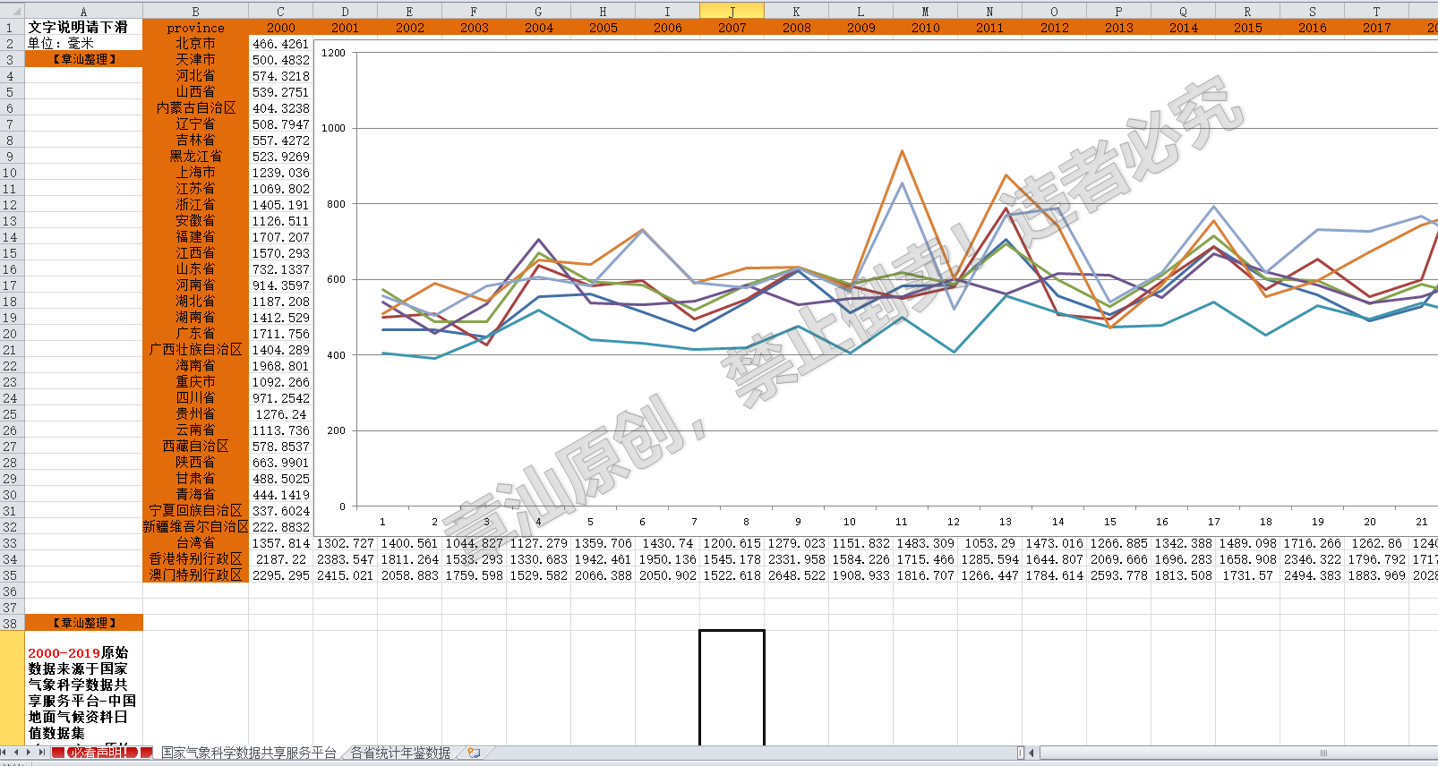 四、说明:2000-2019原始数据来源于国家气象科学数据共享服务平台-中国地面气候资料日值数据集(V3.0),原始数据是各个观测站点的日度数据,为了方便大家使用,使用 Barnes 方法(先使用 IDW 法插值成格点数据(覆盖中国的 500x500 网格,每个网格的大小是 0.1231924经度 x 0.0994549纬度),再分区域平均)计算得到了2000 年~2019 年中国各省年度降水量。2020-2021的数据,黑体的来源于各省统计局披露数据(大约50%),红体的是没有统计的,为作者移动平均预测。这种方法经常用于论文数据处理,可放心使用