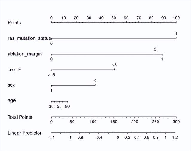 通过hazard function我们可以得到hazard rate,但是对于临床应用来讲,临床医师关心的东西更直观,他们关心的是具体协变量条件下个体的生存概率,画出的列线图常常如下面所示: