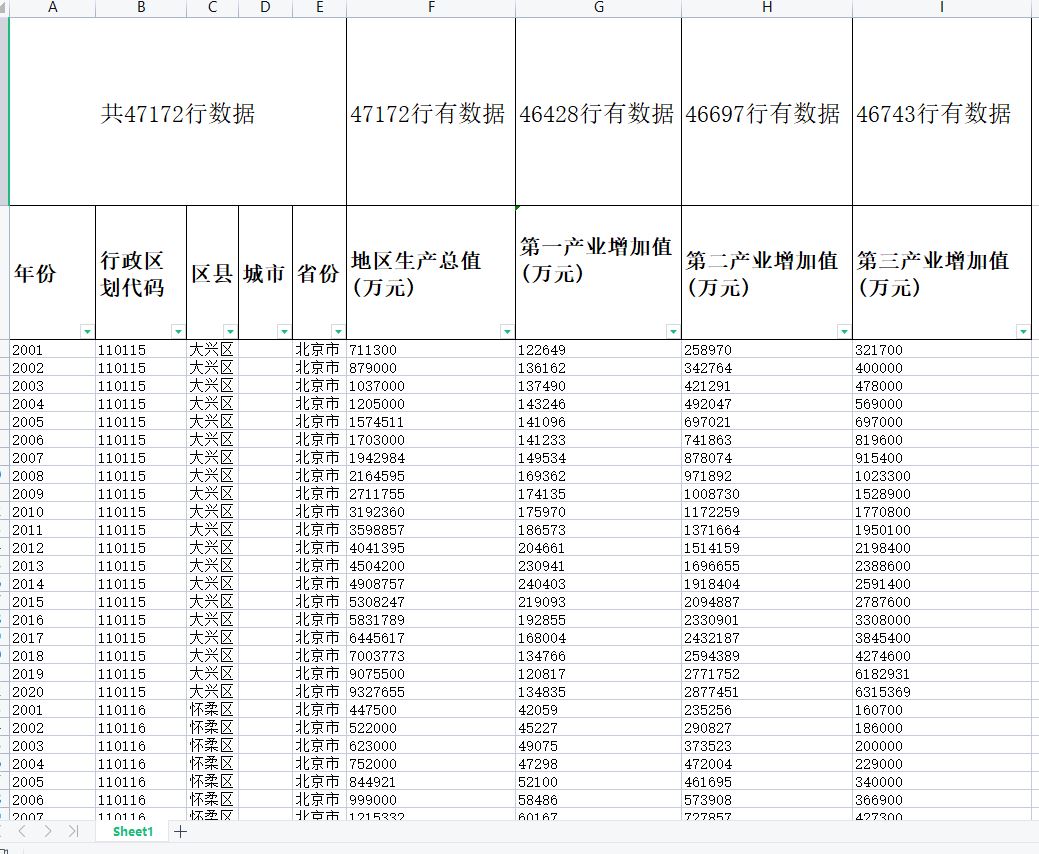 中国各区县地区生产总值GDP第一二三产业增加值数据2000-2020年-EXCEL