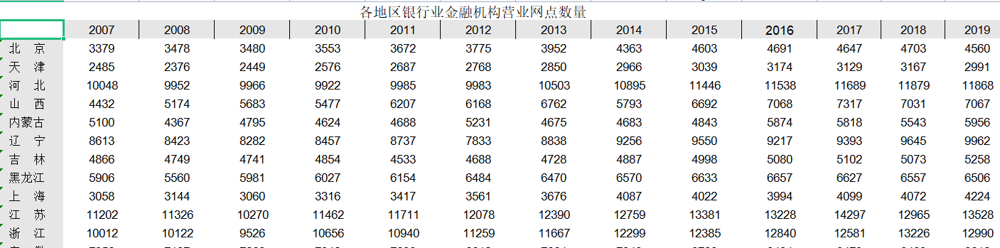 各省银行业金融机构营业网点数量2007-2019