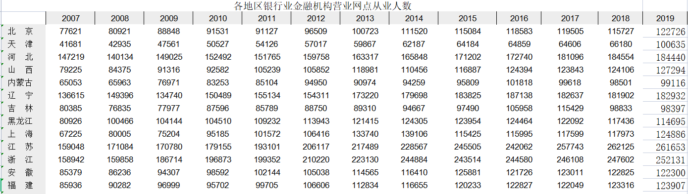 各省银行业金融机构营业网点从业人数2007-2019