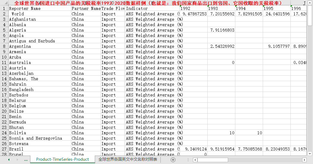 进出口国际贸易中国对全球世界各国进口出口加权平均关税AHS税率1992-2020