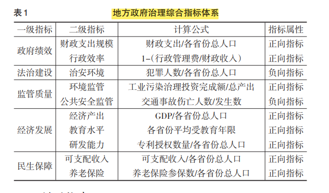 4、指标说明:对地方政府治理能力进行综合评价,包括五个一级指标:政府绩效、法治建设、监管质量、经济发展和民生保障。