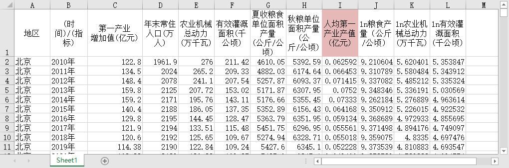 全国31个省份乡村振兴产业兴旺指标2010-2021人均第一产业增加值常住人口农业机械总动力有效灌溉面积粮食产量