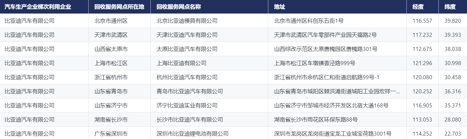 新能源汽车动力蓄电池回收服务网点数据