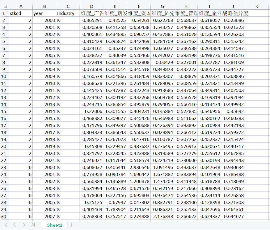 利用 6 个关键战略维度指标分别减去同行业当年该指标的平均值,再除以该指标的标准差予以标准化等处理后得到最终结果。dta,excel版本都有。