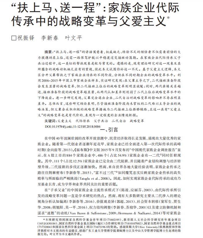 参考文献:“扶上马、送一程”:家族企业代际传承中的战略变革与父爱主义