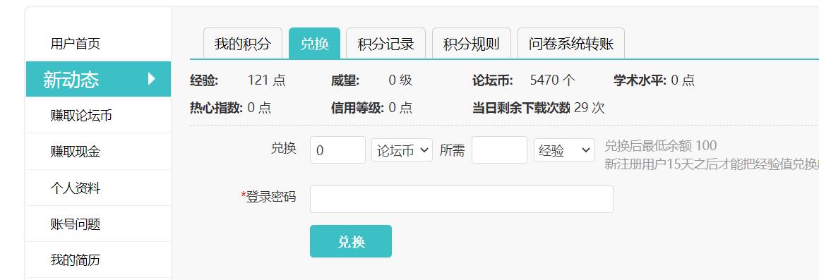 我们在下载资料包时,会用到论坛币。论坛币与经验值兑换路径分享如下:点击“用户中心”-“新动态”(如下图)选择“兑换”即可。